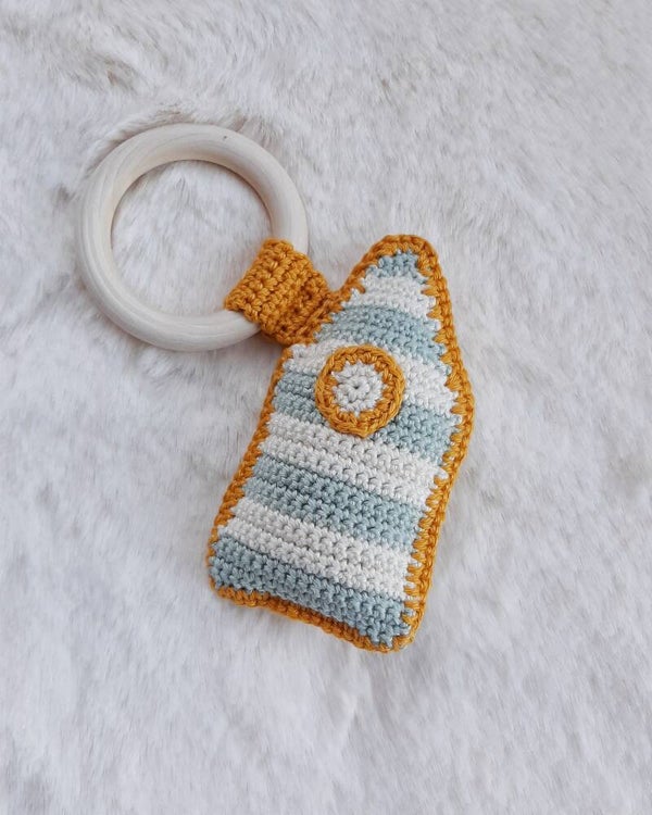 Deze 'kabine' rammelaar voor baby's is gehaakt met kwaliteitsvolle katoengaren.